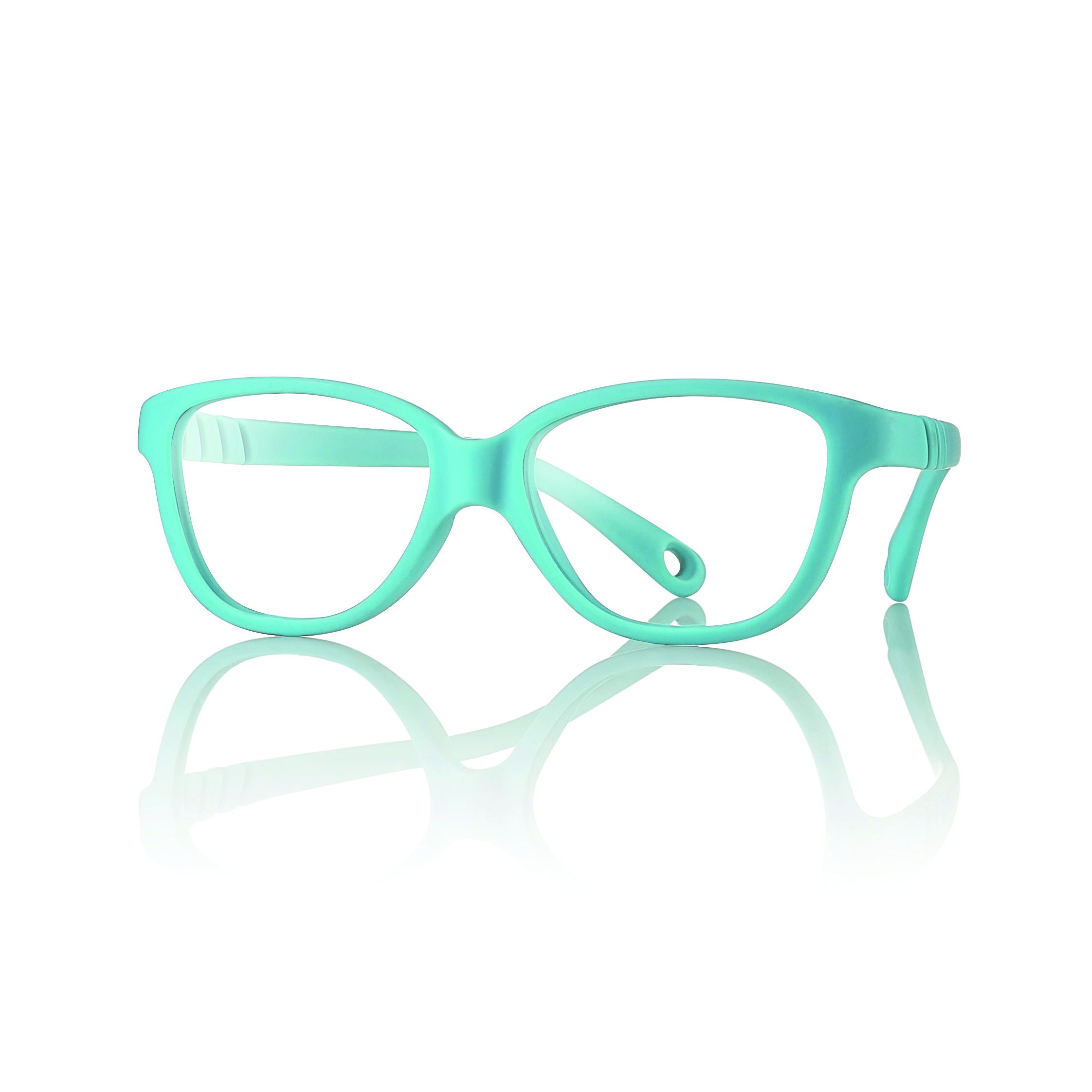 A armação é feita em borracha macia em peça única, com ponte anatômica central que mantém os centros ópticos corretamente alinhados.